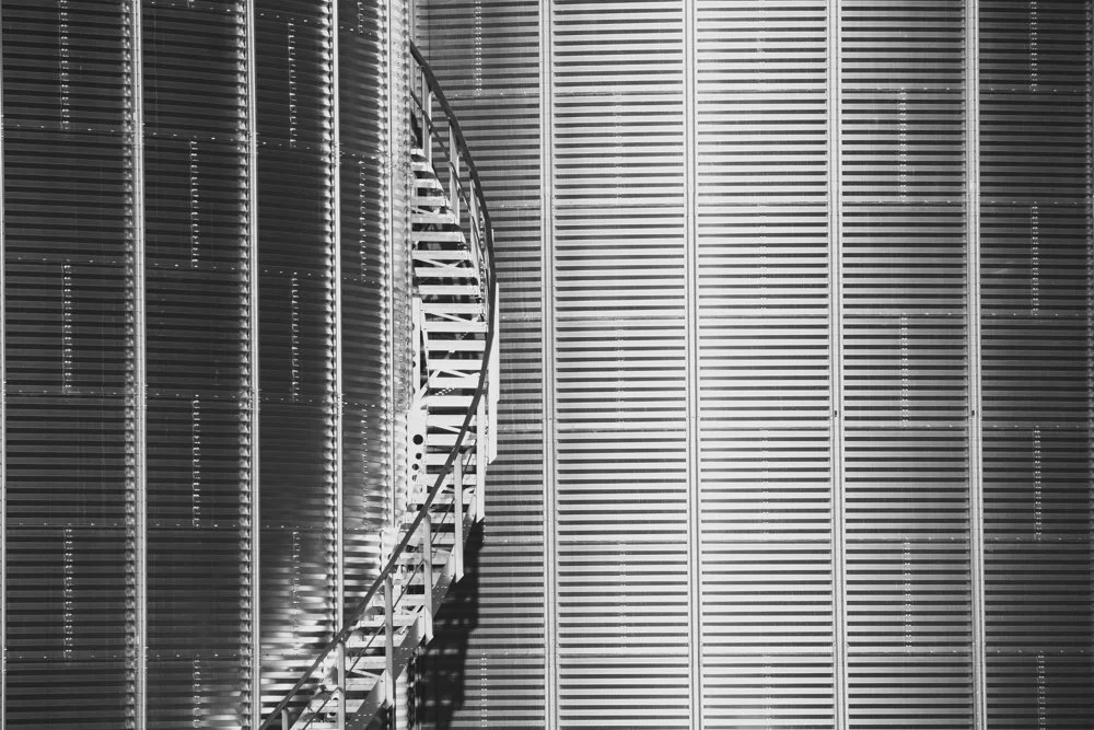 Sometimes, while you are out wandering through the backroads of Alberta, you find such ordinary things that became extra originary. I spotted the grain bins from a distances and didn’t really think much of them until we got a little closer. Between the light, shadows, reflections, lines and the spiral street case, we had to stop!!
